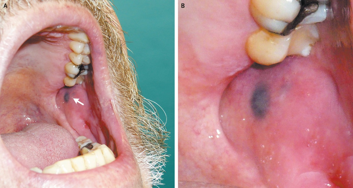 - Yellow brown on surface of oral tissues and surface of teeth (cervical + interproximal)